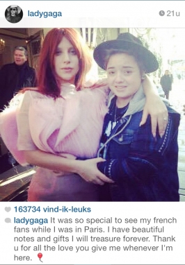 Amazing artist Lady Gaga wearing DORHOUT MEES Couture during Paris Fashion Week. Here seen with one of her fans.Click here.
