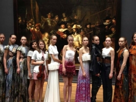 Today Dorhout Mees presented a collection overview, in front of the 'Nachtwacht' at Rijks museum. Each collection was accompanied by it's own music, violin, frensch poetry by Paul eluard, celtic singing, Flamenco guitar ans a DJ.